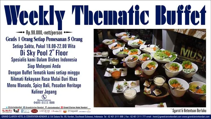 Public Relation Grand Clarion Hotel Kendari, Mytha melalui siaran pers yang diterima Zonasultra.com, Sabtu (23/7/2016) mengatakan, suasana swimming pool memberikan kesan berbeda dari tempat-tempat lainnya sehingga tempat ini menjadi salah satu tempat favorit dan buka setiap hari. Namun, khusus hari Sabtu, pihaknya menyediakan sesuatu yang spesial dengan thema weekly thematic buffet, dimana makanan yang disajikan beragam setiap minggunya.