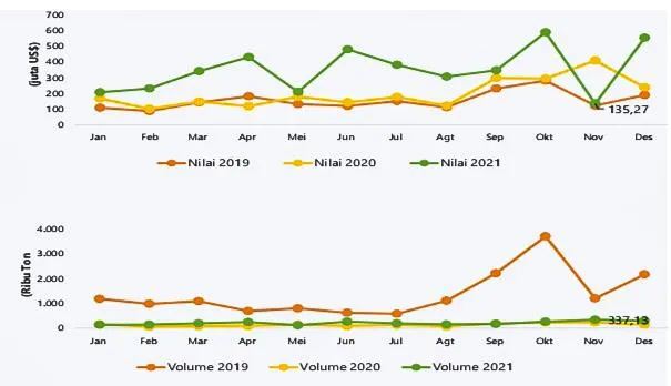 Sementara, volume ekspor kumulatif Januari hingga Desember 2021 mengalami kenaikan 104,89 persen dibanding periode yang sama pada 2020 yaitu dari 1.625,51 ribu ton menjadi 2.508,95 ribu ton.