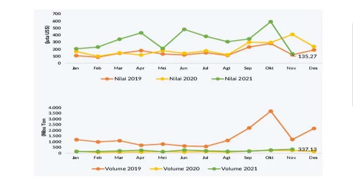 Sementara, volume ekspor kumulatif januari hingga november 2021 mengalami kenaikan 49,35 persen dibanding januari-november 2020 yaitu dari 1.479,15 ribu ton menjadi 2.209,07 ribu ton.