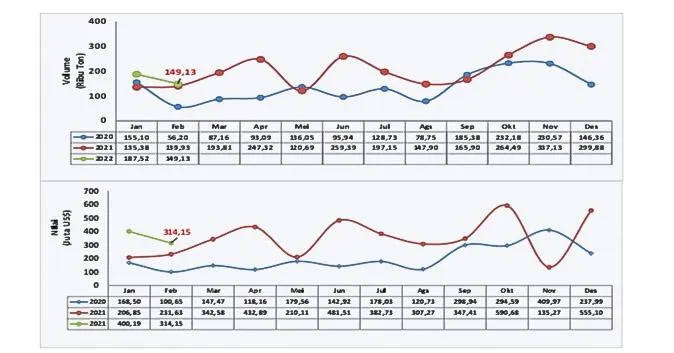 Sementara, volume ekspor kumulatif Januari hingga Februari 2022 mengalami kenaikan 22,28 persen dibanding periode yang sama tahun sebelumnya, yaitu dari 275,30 ribu ton menjadi 336,65 ribu ton. (b)