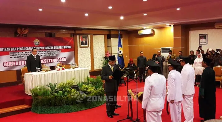 ZONASULTRA.COM, KENDARI – Gubernur Sulawesi Tenggara (Sultra) Nur Alam Resmi melantik tiga Penjabat (Pj) Bupati, yaitu Buton Selatan (Busel) Ilah Ladamay, Buton Tengah (Buteng) Laode Ali Akbar dan Muna Barat (Mubar) Rony Yakob di Ruangan Sangia Nibandera, Rujab Gubernur Sultra, Jumat (21/10/2016)