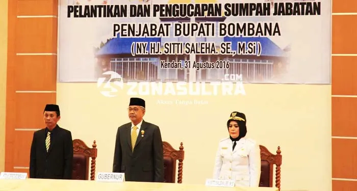 PELANTIKAN PJ BUPATI – Gubernur Sultra Nur Alam, melantik Siti Saleha sebagai Penjabat Bupati Bombana Selasa (31/8/2016) menggantikan Tafdil-Mashura yang masa jabatannya telah usai. (Sumarlin/ZONASULTRA.COM)
