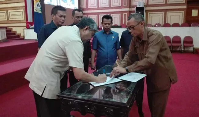 Penandatangan dilakukan antara Gubernur Sultra Nur Alam bersama pimpinan DPRD, terdiri atas Ketua Abdurahman Saleh, Wakil Ketua Amiruddin Nurdin, Jumardin dan Nursalam Lada, pada rapat paripurna DPRD di Gedung Peripurna DPRD Sultra, Selasa (13/12/2016).