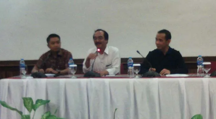 SOSIALISASI OJK – Kepala OJK Sultra) Widodo (tengah baju putih) didampingi Kepala Departemen Pengawasan Pasar Modal Gonthor R Aziz (baju hitam) dan perwakilan Bursa Efek Indonesia (BEI) Fajar (batik coklat) saat memberikan materi sosialisasi dan edukasi terpadu dihadapan wartawan lokal, di Aula Patuno Resort, Wakatobi, Sabtu (26/11/2016). (RAMADHAN HAFID/ZONASULTRA.COM)
