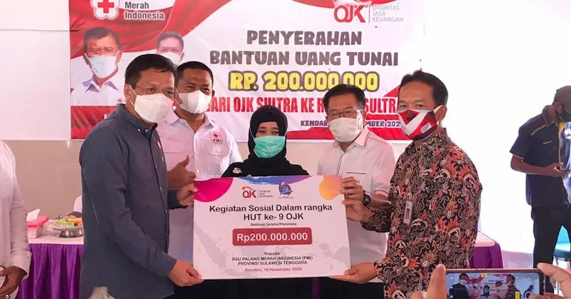 ZONASULTRA.COM, KENDARI – Otoritas Jasa Keuangan (OJK) Provinsi Sulawesi Tenggara (Sultra) menyerahkan bantuan uang tunai sebesar Rp200 juta untuk pembangunan (renovasi) Rumah Sakit (RS) Palang Merah Indonesia (PMI) Sultra di Kendari.