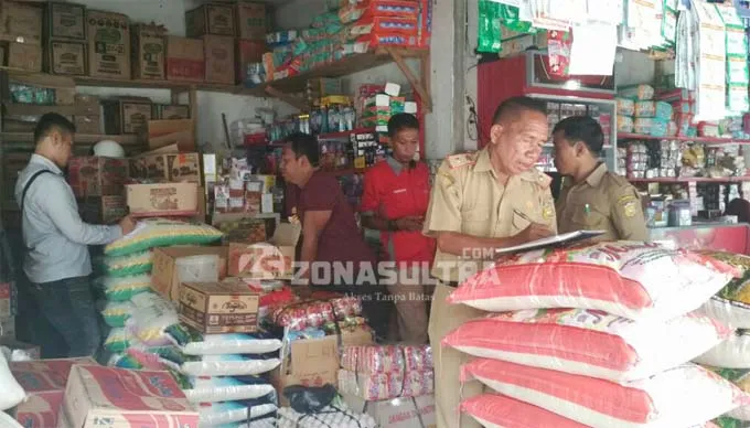 OPERASI PASAR - Kasat Reskrim Buton Iptu Hasanudin, Kabid dan staf Dinas Perdagangan Buton, saat memantau barang disalah satu toko masyarakat di Pasar Kaloko, Selasa (12/12/2017). (Nanang/ZONASULTRA.COM)