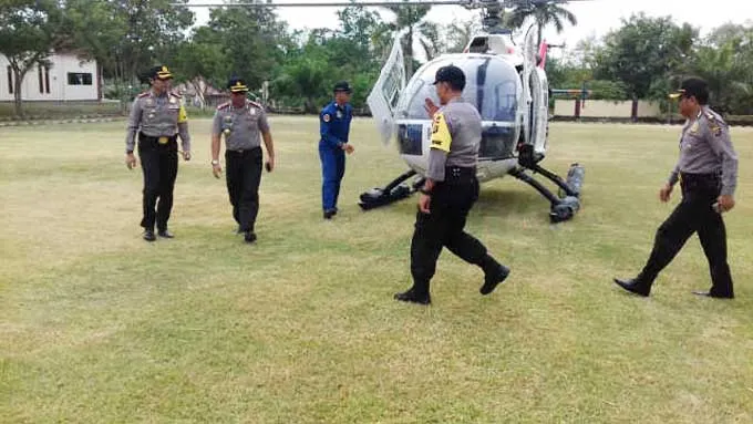 KUNJUNGAN WAKAPOLDA - Wakapolda Sultra Kombes Pol Bambang Priambadha saat mendarat di pelataran Polres Bombana pada kunjungan di daerah itu jelang hari H Pilkada. (Jumrad Raunde/ZONASULTRA.COM)