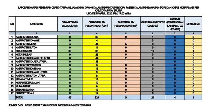 Laporan harian Orang Tanpa Gejala (OTG), Orang Dalam Demantauan (ODP), Pasien Dalam Pengawasan (PDP) dan kasus konfirmasi Per Kab/Kota Prov.Sultra Update 15 April 2020 Jam 17.00 Wita. (Sumber Data : Posko Gugus tugas Covid-19 Provinsi Sulawesi Tenggara)
