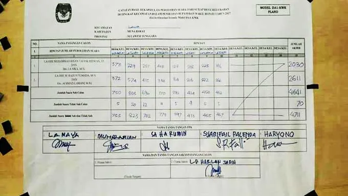 HASIL PLENO : Hasil pleno perhitungan suara tingkat kecamatan, LM.Ihsan Taufik Ridwan suara di Basisnya La Nika memperoleh suara 2030 sementara pasangan calon Bupati-wakil LM.Rajiun Tumada-Achmad Lamani memperoleh suara 2611 dengan selisih 581 suara, suara batal sebanyak 70 suara, Jumat (17/2/2017).(Laode Pialo/ZONASULTRA.COM)