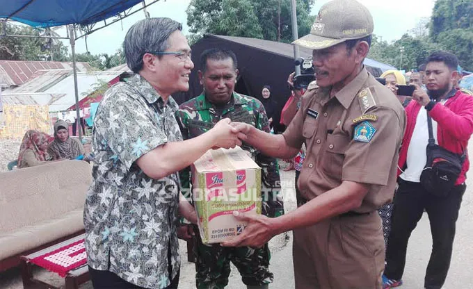Peduli Korban Banjir, PLN Salurkan Bantuan Untuk Korban Banjir Kali Wanggu BANTUAN – General Manager (GM) PLN wilayah Sulselrabar Bob Saril saat menyerahkan bantuan untuk korban banjir Kali Wanggu kepada Camat Baruga Quraisy Hamzah, Selasa (16/5/2017). Bantuan yang diberikan berupa sembako, selimut, sarung, obat-obatan, dan pampers untuk balita, dengan total nilai mencapai Rp. 40 juta. (RAMADHAN HAFID/ZONASULTRA.COM)