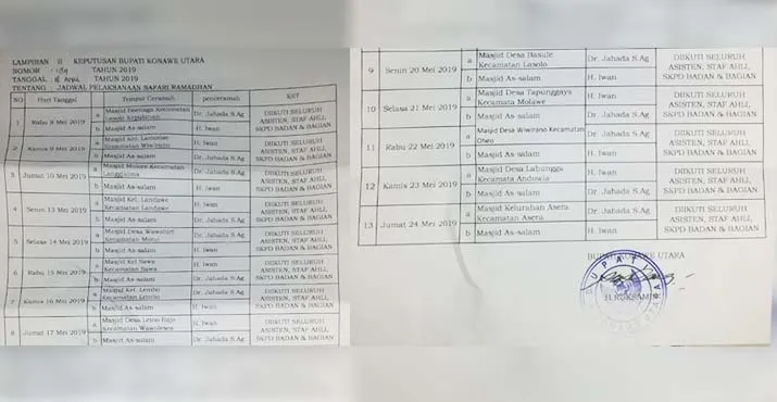 Kewajiban itu tertuang dalam Surat Keputusan Bupati Konut nomor 189, tanggal 18 April 2019 tentang himbauan para Aparatur Sipil Negara (ASN) itu untuk mengikuti kegiatan Safari Ramadan yang digelar oleh pemerintah daerah setempat.