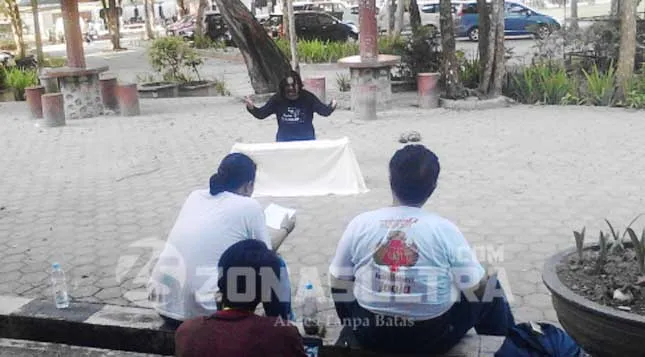 LATIHAN – Mahasiswa Universitas Gadjah Mada (UGM) sedang melakukan latihan Monolog Mayat Terhormat untuk ditampilkan pada Peksiminas XIII yang akan digelar pada hari Sabtu (15/10/2016) di Auditorium Mokodompit UHO Kendari. Jumat (14/10/2016) (KASMAN/ZONASULTRA.COM)