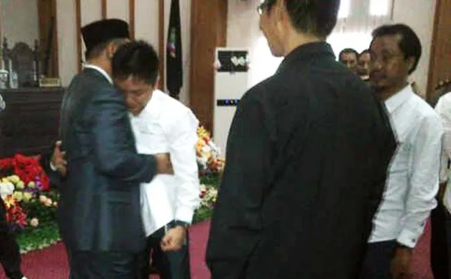 Rasa haru yang mendalam dan bahagia disertai isak tangis terlihat saat ketua Komisi C, Samir, memeluk Ruksamin dan Raup. Baik Samir, Ruksamin maupun Raup tak bisa menahan tetesan air matanya. Mereka pun larut dalam pelukan erat satu sama lainnya.