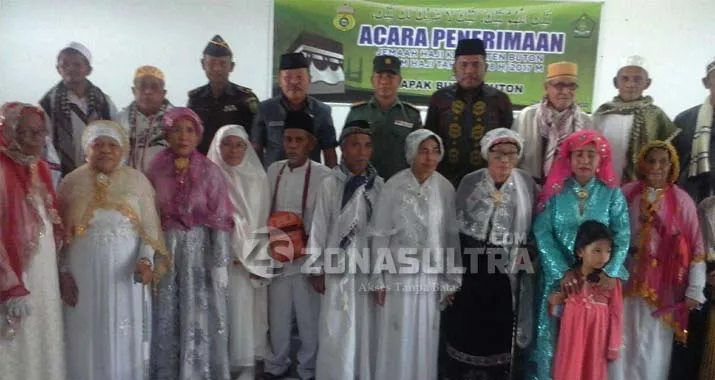 JEMAAH HAJI – Asisten III Setda Buton Makmur, Kepala Kandepag Muchtar serta Koramil Pasarwajo menyambut kepulangan 20 Jamaah Haji asal daerah itu di Aula Kantor Bupati. (Nanang Suparman/ZONASULTRA.COM)