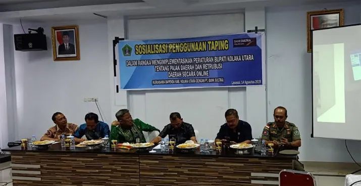 SOSIALISASI - Pemerintah Kabupaten (Pemkab) Kolaka Utara (Kolut), Sulawesi Tenggara (Sultra) memperkenalkan sistem pajak online dalam rangka mengimplementasikan Peraturan Bupati (Perbub) tentang Pajak Daerah dan Retribusi bekerja sama Badan Pendapatan Daerah (Bapenda) dan Bank Sultra untuk meningkatkan Pendapatan Asli Daerah (PAD). (Rusman/ZONASULTRA.COM)