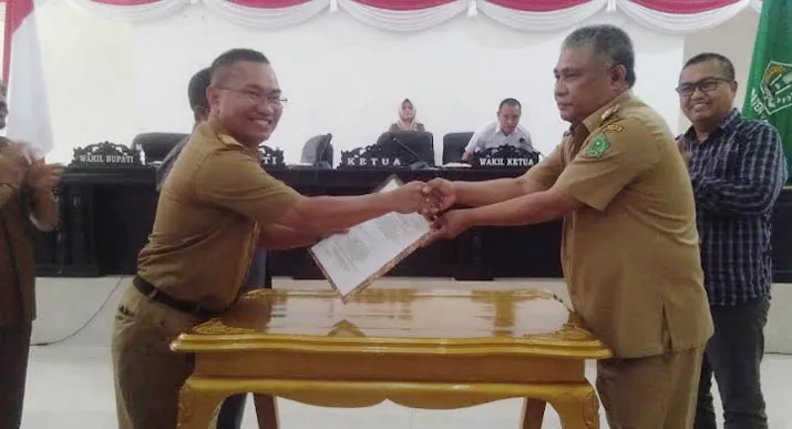 ASET - Bupati Konawe, Kery Saiful Konggoasa saat menyerahkan berita acara penyerahan aset daerah senilai Rp102 miliar ke Pemda Konkep yang diterima langsunf oleh Sekda Konkep Cecep Trisnajayadi di gedung paripurna DPRD Konawe. (Restu/ZONASULTRA.COM)