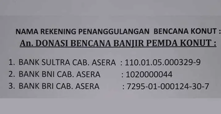 ZONASULTRA.COM, WANGGUDU – Pemerintah Daerah (Pemda) Kabupaten Konawe Utara (Konut), Sulawesi Tenggara (Sultra) membuka rekening donasi untuk korban banjir bandang di wilayah itu.