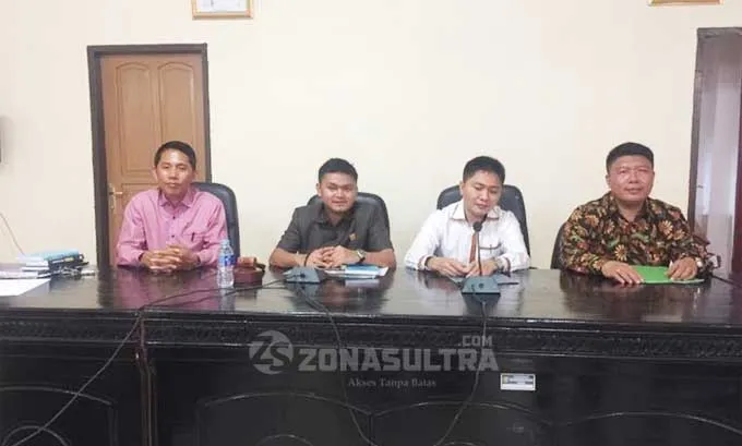 KONFRENSI PERS - Ketua DPRD Konawe Utara, Jefri Prananda bersama tiga pimpinan komisi yang baru usai menggelar pemilihan alat kelengkapan dewan bertempat di gedung dewan setempat, Selasa (11/4/2017).(MURTAIDIN/ZONASULTRA.COM).