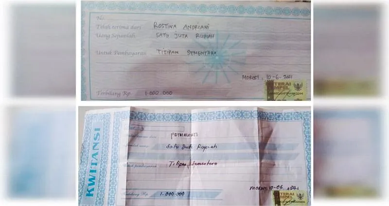 Keduanya mengaku telah membayar DP sebesar Rp 1 juta dengan bukti kwitansi bermaterai dengan isi materai bertuliskan “titipan sementara” belum mendapatkan panggilan.