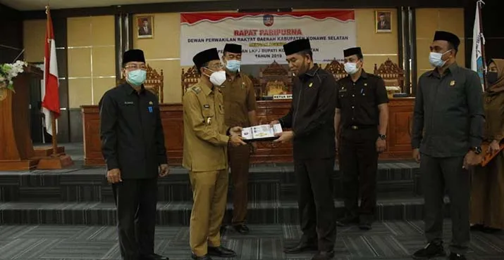 ZONASULTRA.COM,ANDOOLO-Dewan Perwakilan Rakyat Daerah (DPRD) Kabupaten Konawe Selatan (Konsel) Sulawesi Tenggara (Sultra) menerima penyerahan Laporan Keterangan Pertanggungjawaban (LKPJ) tahun anggaran 2019 pemerintah daerah setempat dalam rapat paripurna yang digelar digedung DPRD Konsel, Senin (18/5/2020).