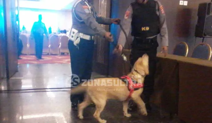 Dua anjing jenis pelacak bahan peledak (Handak) itu menyisir setiap sisi dan sudut area pencabutan nomor urut di lantai 2 Ballroom Hotel Clarion Kendari. Anjing jenis ini melacak bahan peledak maupun bom sebelum dimulainya acara.