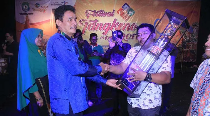 Pengembangan Destinasi Wisata Tangkeno Butuh Kerjasama Lintas Sektoral WISATA TANGKENO – Wakil Bupati Bombana, Johan Salim saat menyerahkan piala kepada peraih juara umum Festival Budaya Ke-5 di Tangkeno, Rabu (18/10/2017) malam. (MUHAMMAD JAMIL/ZONASULTRA.COM)