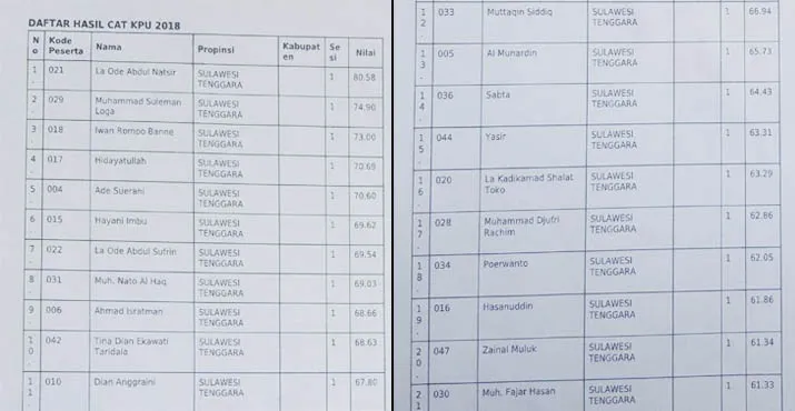 Di urutan ke lima ditempati Ketua KPU Kota Kendari Ade Suerani dengan nilai 70,60. Sementara anggota KPU Sultra Tina Dian Ekawati Taridala berada di urutan 10 dengan nilai 68,63.