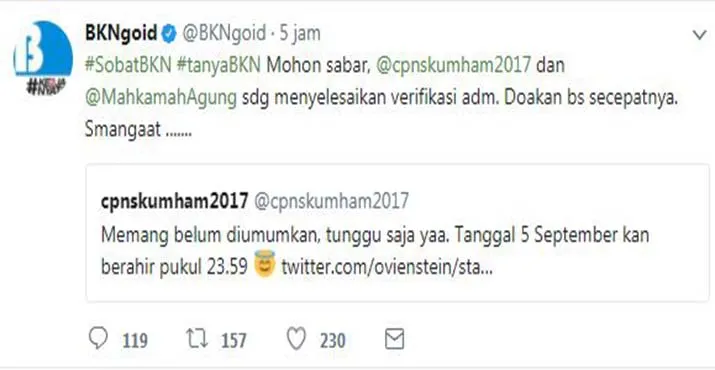 Seperti dilansir di Kabar24.com, penyampaian tersebut disampaikan langsung melalui akun Twitter resmi BKN “Mohon sabar, @cpnskumham2017 dan @MahkamahAgung sdg menyelesaikan verifikasi adm. Doakan bs secepatnya. Smangaat …….”. Postingan tersebut diunggah sekitar tiga jam lalu melalui akun @BKNgoid.