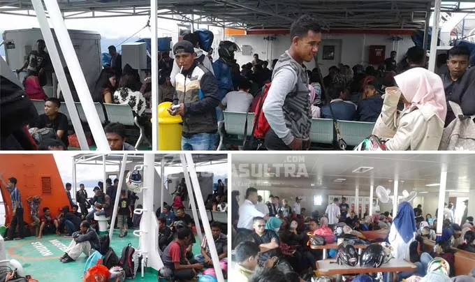 PENUMPANG MELONJAK – Untuk melayani lonjakan pemudik, KM Bahteramas II trip hingga 16 kali PP Dermaga Amolengo ke Labuan, Sabtu (24/6/2017). Terlihat Dek kapal KM Bahteramas II dipadati pemudik. (Nova Ely Surya/ZONASULTRA.COM)