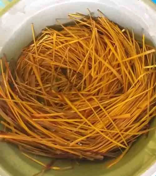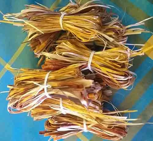 Proses pengolahannya cukup panjang. sorume yang masih kaku dan keras direndam air selama sepekan. Lalu, setiap batang umbi dikeluarkan isi dalamnya hingga tersisa bagian serat luar yang berwarna kuning keemasan. Serat ini lalu dililitkan ke batangan bambu untuk dijemur 3 hari.
