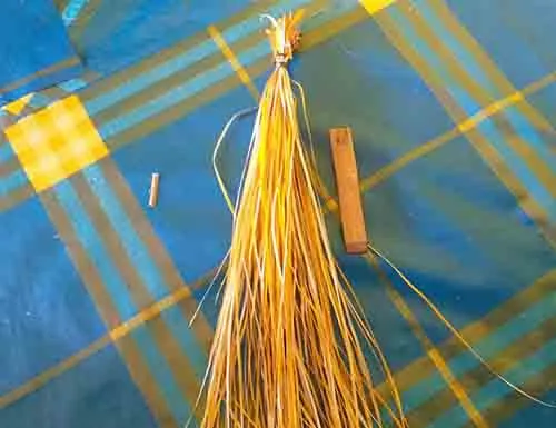 Setelah dibuka dari batangan bambu, berbentuk pita kecil yang siap dianyam. Pita ini dibelah-belah memanjang sesuai keperluan, barulah dianyam menjadi beragam hasil. Asnawati memproduksi songkok, tikar adat, alas kalosara (berbentuk tikar persegi), dan tas.