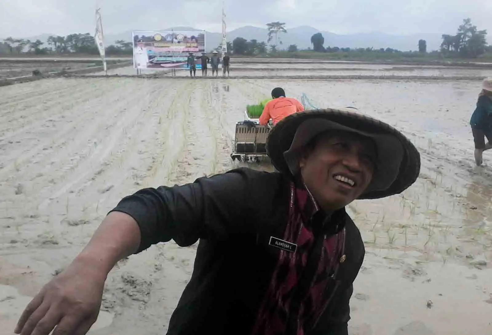 Tanam Padi - Sekretaris Daerah (Sekda) Kendari Alamsyah Lotunani usai mencanangkan penanaman padi sawah di Amohalo, Kelurahan Baruga, Kendari, Kamis (10/3/2016). Dalam acara tersebut petani diberikan bantuan 3 mesin tanam padi dari Kementerian Pertanian. (M. Taslim Dalma/ZONASULTRA.COM)