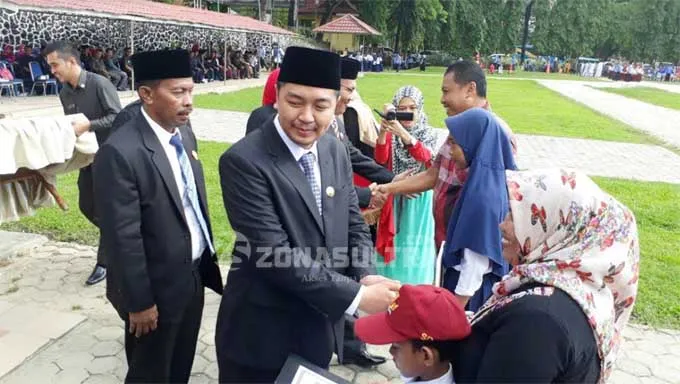 PERINGATAN HARI SUMPAH PEMUDA – Wali Kota Kendari Adriatma Dwi Putra (ADP) menyerahkan secara simbolis bantuan beasiswa bagi siswa miskin dan berprestasi. Penyerahan beasiswa ini dilakukan disela-sela upacara bendera dalam rangka memperingati hari sumpah pemuda di halaman Kantor Wali Kota Kendari, Senin (30/10/2017). (RAMADHAN HAFID/ZONASULTRA.COM)