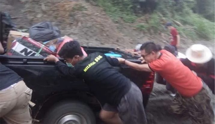 Kendaraan yang membawa bantuan mengalami kendala. Tanjakan licin dan berlumpur yang berada di desa Tutui, Kecamatan Tinondo membuat kendaraan single cabin yang dikendarai Tamsil (relawan SBM) kesulitan mendaki. Samsul Bahri dan tim relawan pun bersama-sama mendorong sampai akhirnya tanjakan itu berhasil dilalui. Perjalanan pun kembali dilanjutkan.