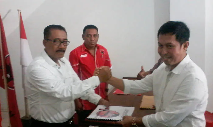 Pendaftaran PDIP - Bakal calon (Balon) Walikota Kendari Andi Musakkir Mustafa saat mendaftar di Partai Demokrasi Indonesia Perjuangan (PDIP) Kota Kendari. Berkas pendaftaran tersebut diterima langsung oleh Ketua Dewan Pimpinan Cabang (DPC) PDIP Kendari Alwi di Sekretariat PDIP Kendari, Rabu (24/2/2016). (Muhamad Taslim Dalma/ZONASULTRA.COM)