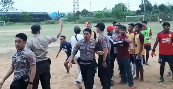 Polisi yang mengamankan pertandingan itu kemudian melerai pihak yang berseteru. Tetapi. tiba-tiba salah seorang official datang kemudian menendang wasit dari belakang.