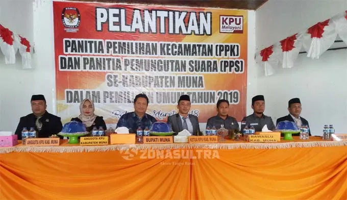 ZONASULTRA.COM, RAHA – Sebanyak 66 orang panitia pemilihan kecamatan (PPK) dan 450 orang panitia pemungutan suara (PPS) untuk pemilihan presiden dan pemilihan legislatif 2019 se-Kabupaten Muna resmi dilantik di Alun-alun Kota Raha oleh Ketua KPU Muna La Ode Amin Rambega, Kamis (8/3/2018).