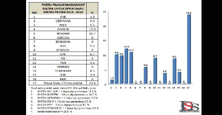 Menurut data LSS, peluang partai politik di Sultra mendapat dua kursi sangat minim. Pasalnya, enam partai yang berada di jajaran teratas, persentasi keterpilihannya jaraknya tidak terlampau jauh. Partai Golkar menduduki tingkat keterpilihan tertinggi dengan persentasi 11.9 persen. Di bawahnya menyusul Partai Nasdem 10.7 persen, Gerindra 9.9 persen, PDI-P 9.5 persen, PPP 8.7 persen, dan Demokrat 8.5 persen.