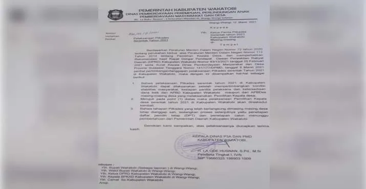 ZONASULTRA.COM,WANGI-WANGI– Pemilihan kepala desa (pilkades) serentak di Kabupaten Wakatobi ditunda. Hal ini setelah adanya surat dari Pemerintah Provinsi (Pemprov) Sulawesi Tenggara (Sultra) melalui Dinas Pemberdayaan Masyarakat dan Desa (DPMD) nomor 141/177/DPMD perihal pertimbangan/tanggapan pelaksanaan Pilkades serentak tahun 2021 di Wakatobi.
