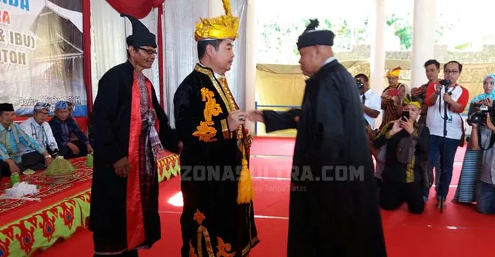 GELAR LA ODE - Lembaga Adat Kesultanan Buton di bawah kepemimpinan La Ode Izat Manarfa memberi gelar La Ode kepada Pj Gubernur Sultra Teguh Setyabudi, Rabu (25/4/2018). (CR3/ZONASULTRA.COM)
