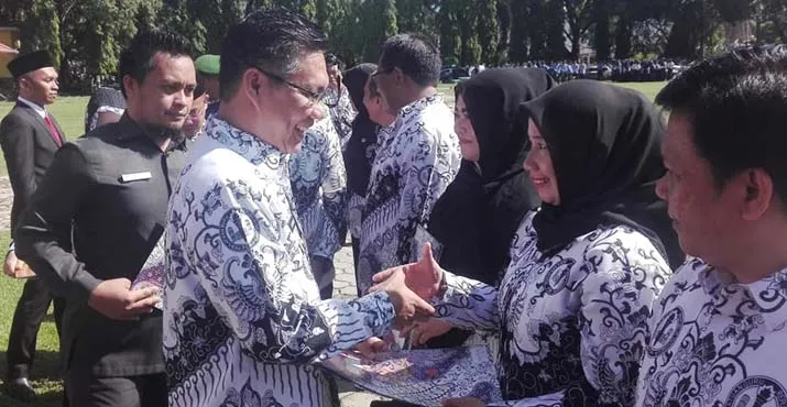 PENGHARGAAN - Pelaksana tugas (Plt) Wali Kota Kendari Sulkarnain Kadir, saat menyerahkan penghargaan kepada 12 guru berprestasi, usai upacara peringatan Hari Guru Nasional dan HUT Persatuan Guru Republik Indonesia (PGRI) Kota Kendari, di halaman kantor wali kota setempat, Kamis (13/12/2018). (RAMADHAN HAFID/ZONASULTRA.COM)