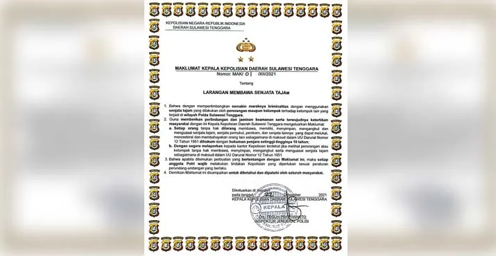 Kasubbid Penmas Humas Polda Sultra Kompol Rony Syahendra menjelaskan, maklumat tersebut dikeluarkan Kapolda Sultra pada 22 Desember 2021 dengan nomor MAK/01/XII/2021. Dengan adanya maklumat ini diharapkan masyarakat bisa paham bila membawa Sajam itu salah.