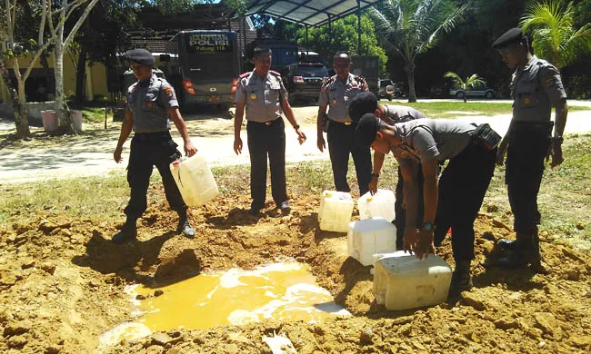 Direktorat Sabhara Polda Sultra musnahkan puluhan jergen arak mata tradisional. Arak mata sebanyak 1.2 ton ini di dapatkan dari hasil Cipkon jelang natal dan tahun baru 2016, Senin (11/1/2015). (Randi/ZONASULTRA.COM)