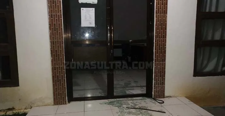 PENGRUSAKAN - Kantor Dishub Mubar yang mengalami pengrusakan akibat salah seorang tenaga pengabdi Jamidin dengan cara melempari pintu kaca tersebut dengan menggunakan batu, kejadiannya sekitar pukul 20.30 wita, Selasa (12/2/2019). (Kasman/ZONASULTRA.COM)