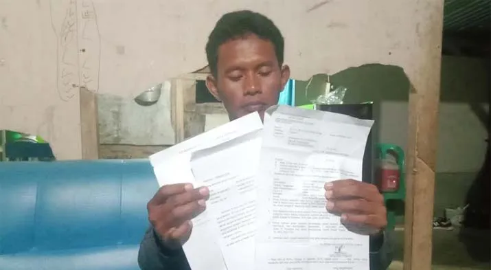 ayah korban Irkon Wahyudi saat menunjukan bukti pengaduanya termaksud surat keterangan rawat jalan pelaku dari rumah sakit jiwa yang diperolehnya saat mediasi kasus anaknya terjadi dirumah kepala desa.