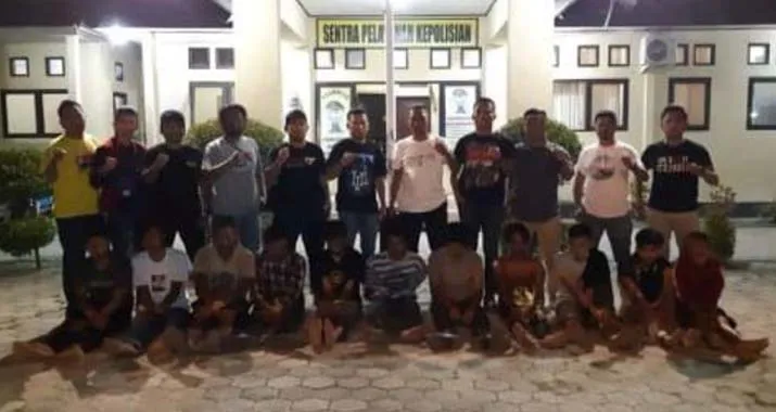 PELAKU TAWURAN - Tim Buru Sergap (Buser) 77 Satuan Reserse dan Kriminal (Satreskrim) Kepolisian Resor (Polres) Kendari bersama Kepolisian Sektor (Polsek) Mandonga berhasil mengamankan sebanyak 11 orang terduga pelaku tawuran di Puuwatu, Minggu (7/7/2019) malam.(Istimewa)