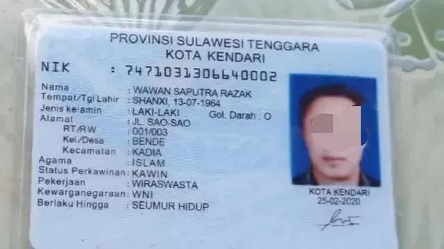 Menurut Singgih menjelaskan dalam kepemilikan KTP itu nama Mister Wang tertulis sebagai Wawan Saputra Razak, dengan nomor induk 7471031306640002, berjenis kelamin pria, lahir di Provinsi Shanxi China pada tahun 1974 dan dengan alamat domisili di Jalan Sao-sao Kelurahan Bende Kecamatan Kadia Kota Kendari.