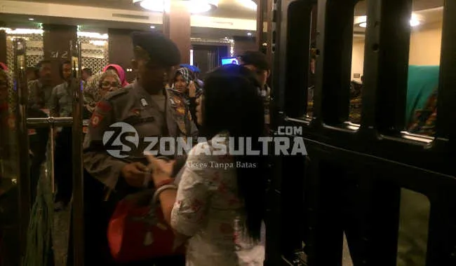 Pemeriksaan kepada simpatisan pasangan calon Walikota Kendari oleh aparat kepolisian di ruang Phinisi Ballroom Hotel Clarion Kendari, Selasa (31/1/2017) malam. (Randi Ardiansyah/ZONASULTRA.COM)