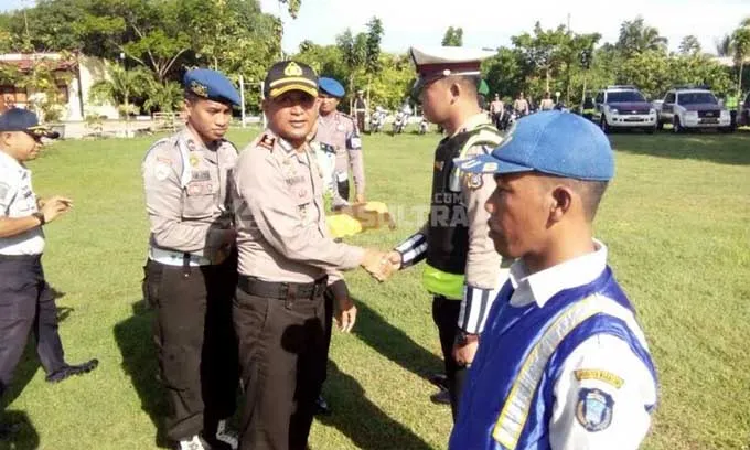 OPERASI ANOA – Upacara Operasi Anoa 2017 yang berlangsung di halaman Polres Wakatobi, Selasa (9/5/2017). Terlihat Wakapolres AKBP Muhadi Walam saat berjabat tangan dengan peserta upacara. (Nova Ely Surya/ZONASULTRA.COM)