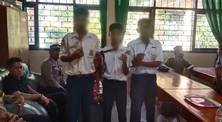 Kata dia, siswa yang membawa anak panah busur ini berjumlah tiga orang yang masih menduduki kelas 8 berjumlah dua orang atas nama Asrun (13) dan Aldiano (13) tambah satu orangnya masih menduduki kelas 9 atas nama Muh. Galang (14).